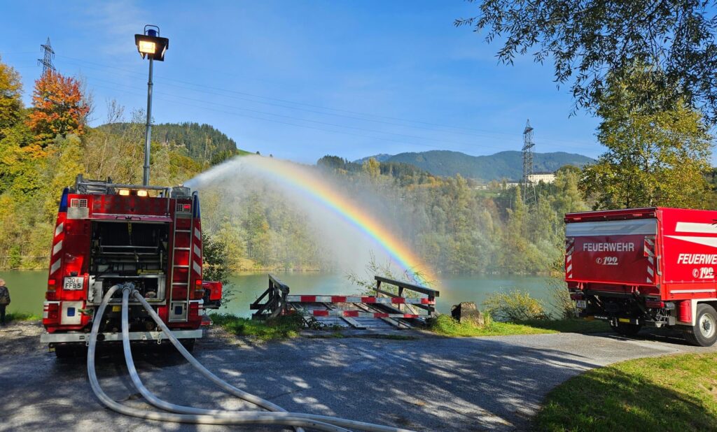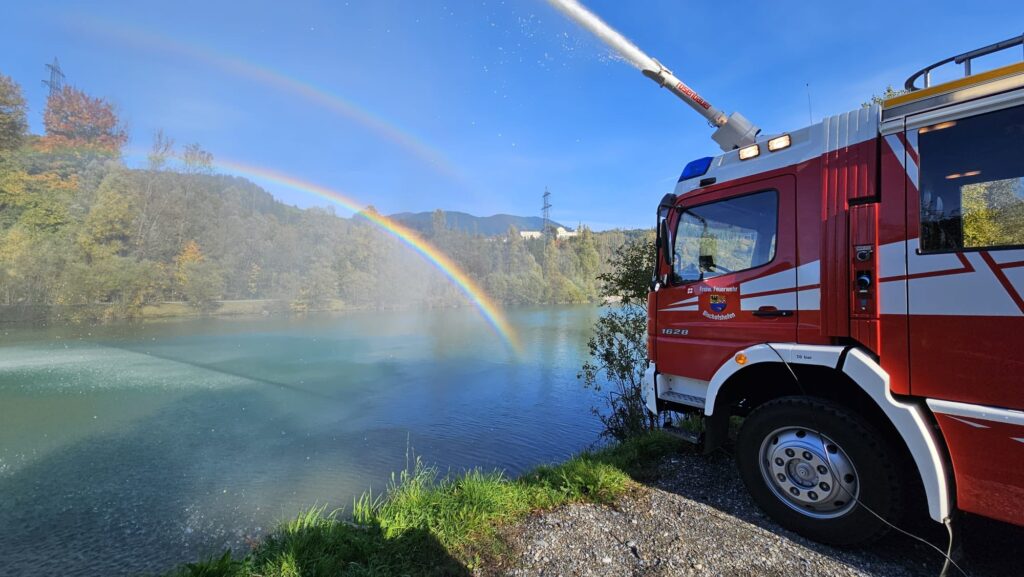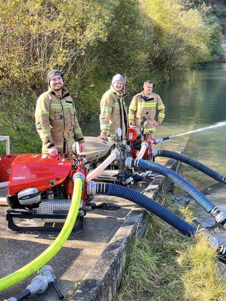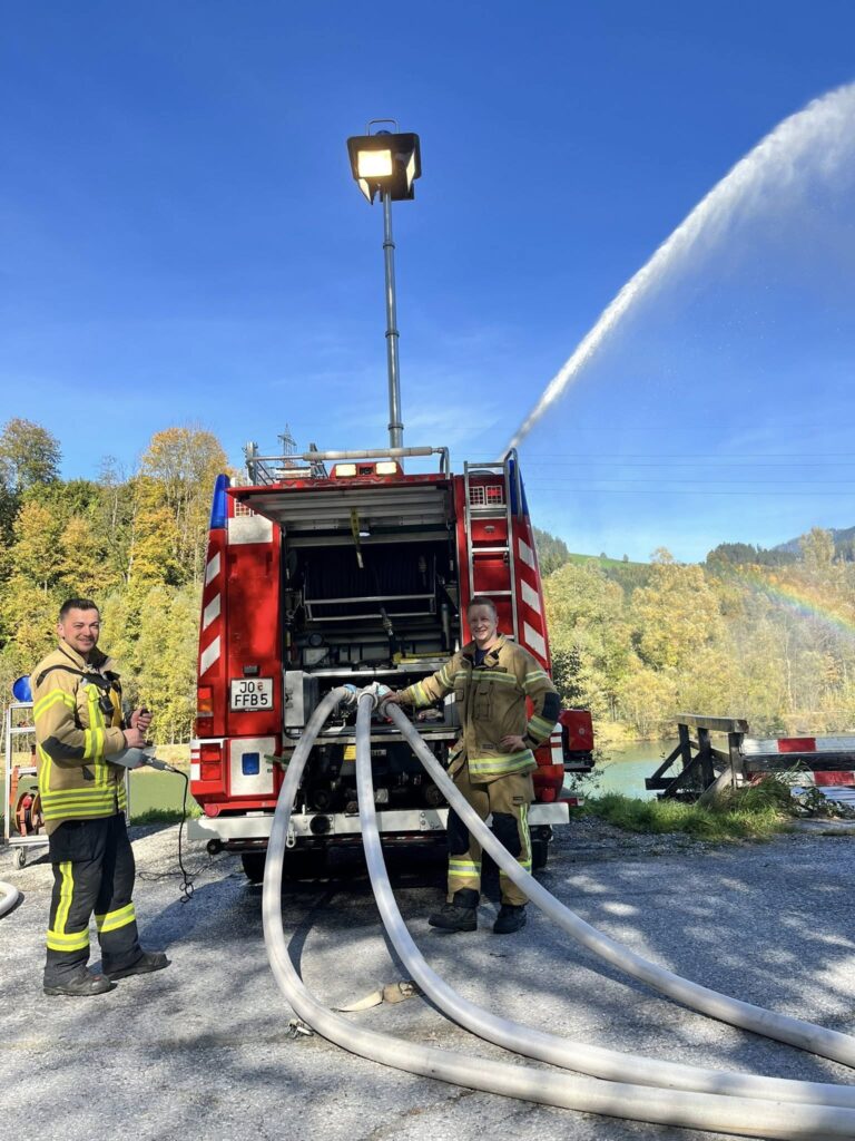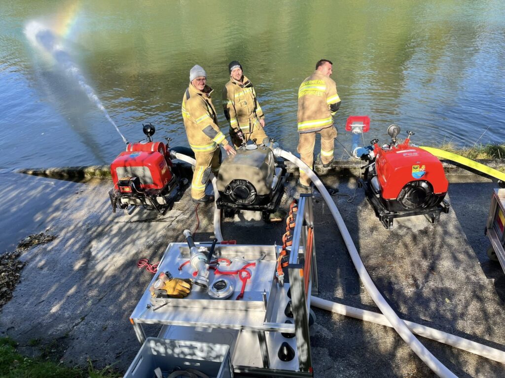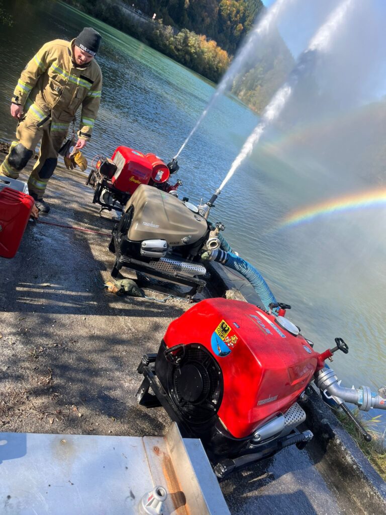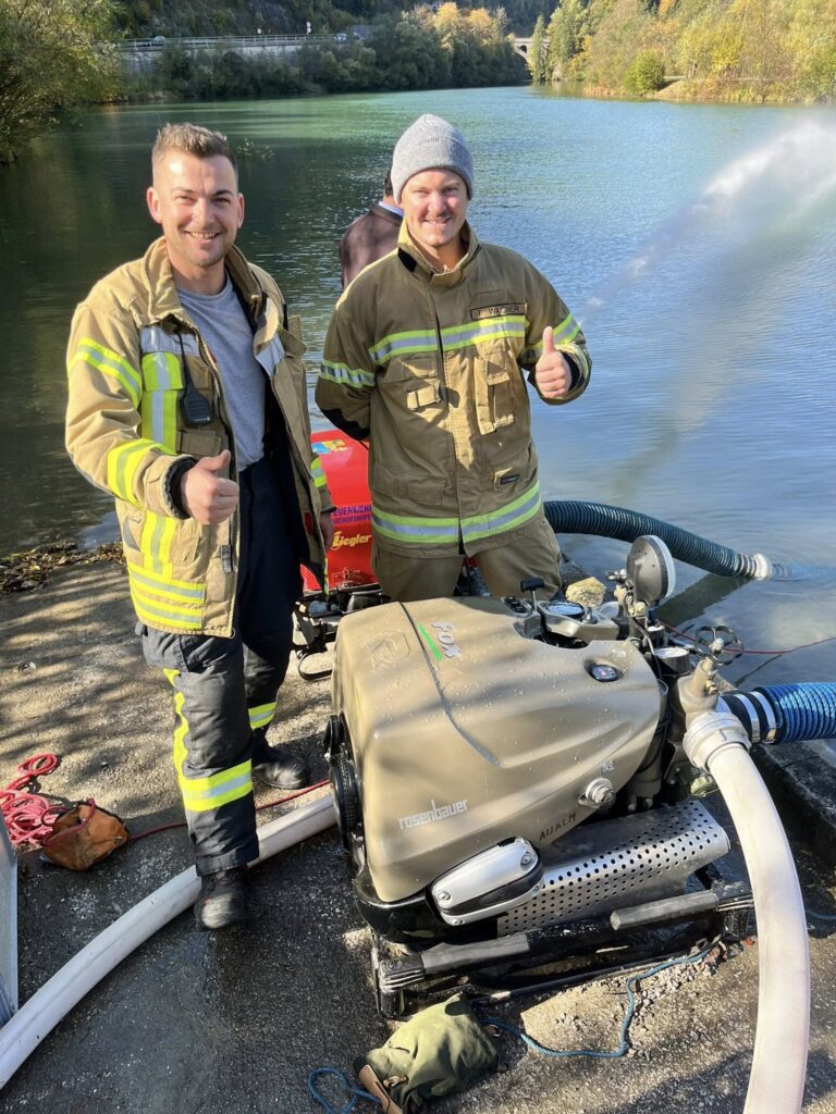Einige unserer Maschinisten nutzten heute den sonnigen Samstagnachmittag, um unsere Tragkraftspritzen nochmals vor der Winterpause in Betrieb zu nehmen. Bei dieser Gelegenheit wurde ebenso eine praktische Schulung auf unseren Neuzugang abgehalten. Zu sehr günstigen Bedingungen konnten wir vom Österreichischen Bundesheer eine ausgesonderte Tragkraftspritze der Marke Rosenbauer Fox-2, in einem ziemlich neuwertigen Zustand samt Zubehör ersteigern. Nach einem umfassenden Service wurde die „grüne“ Pumpe nun offiziell in den Feuerwehrdienst gestellt. Vorteil dieser Pumpe ist die robuste BMW Motorentechnik und die einfache Bedienung. Ein baugleiches Modell in rot führen wir seit Jahrzehnten auf unserem Unimog Löschfahrzeug mit.