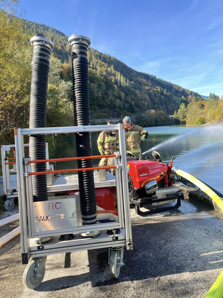 Auch der Schulungsaufwand für die Mannschaft hält sich so in Grenzen, da beide Pumpen bis auf die Farbe praktisch baugleich sind. Verladen wird diese Tragkraftspritze mit einer Normliterleistung von 1.200 Liter pro Minute in Zukunft auf einem Rollcontainer mit umfangreichem Zubehör für eine Saugstelle. Zwei dieser Rollcontainer stehen der Feuerwehr Bischofshofen zur Verfügung. Mit unserem Logistikfahrzeug Last 2 können diese Container samt Schlauchmaterial im Ernstfall schnell und effizient mit wenig Personal zur Einsatzstelle gebracht werden.