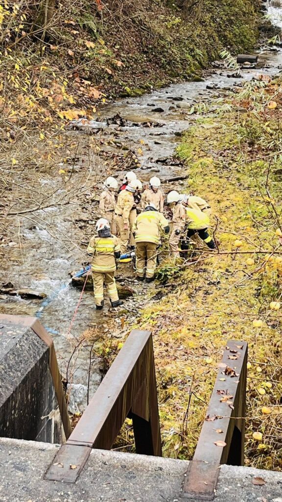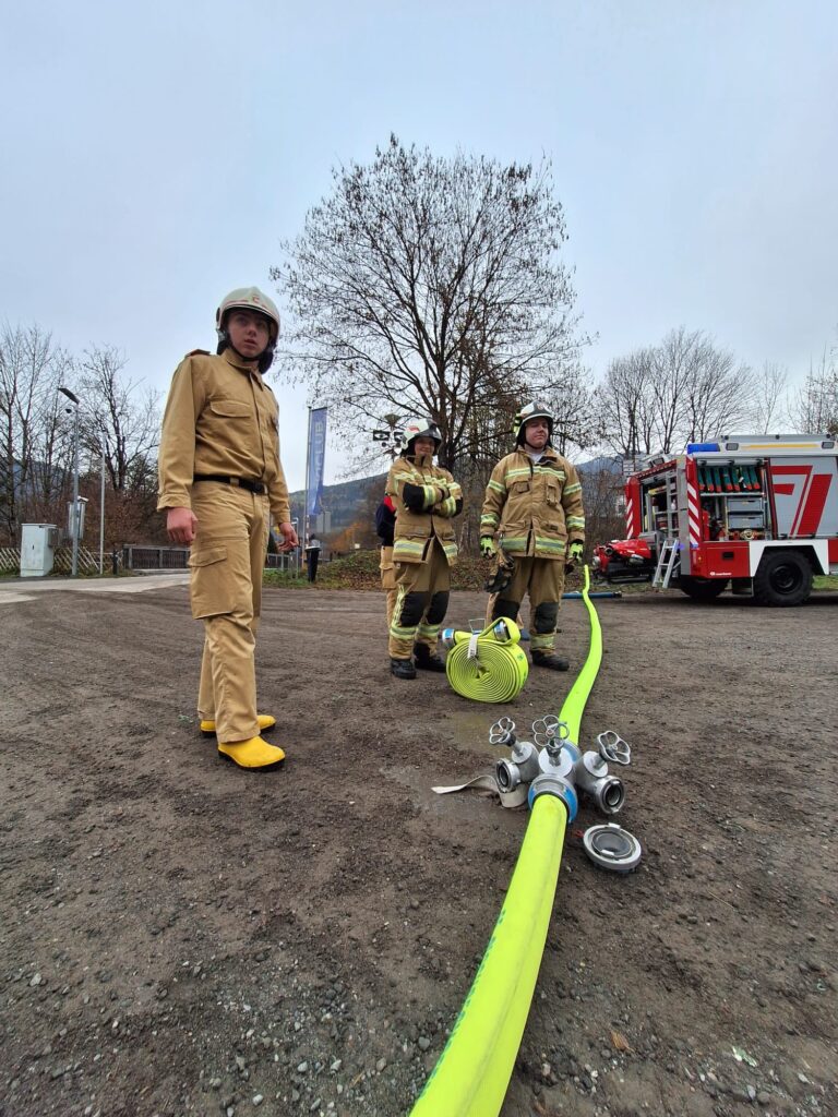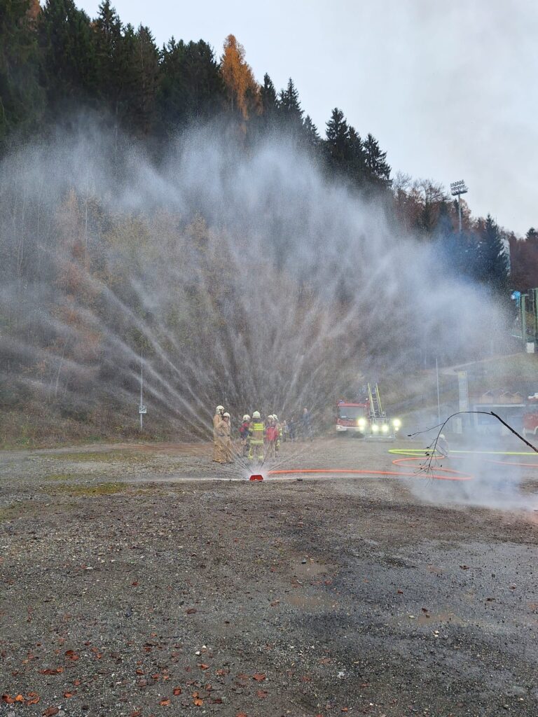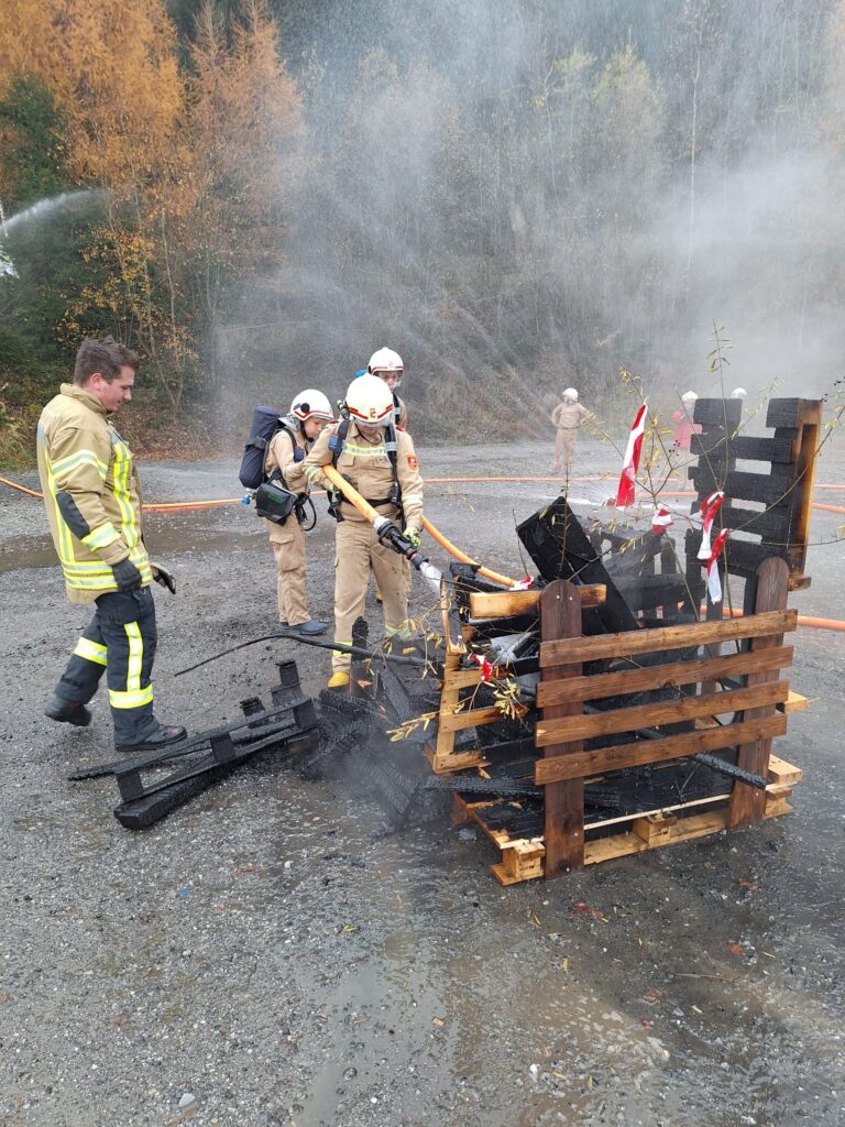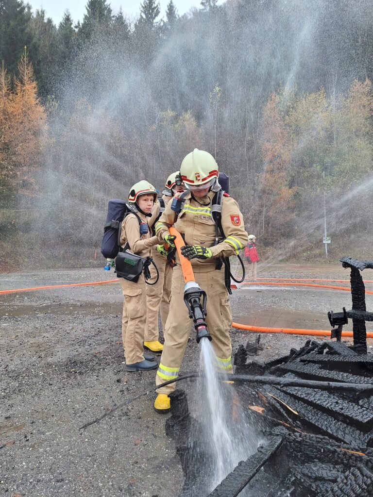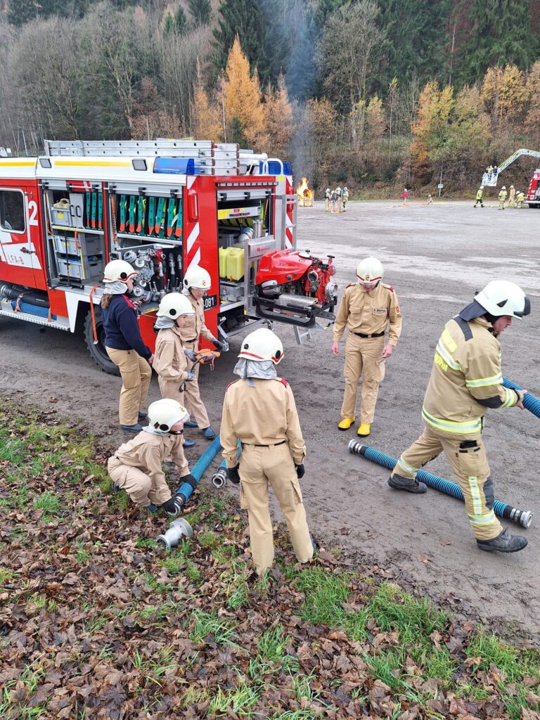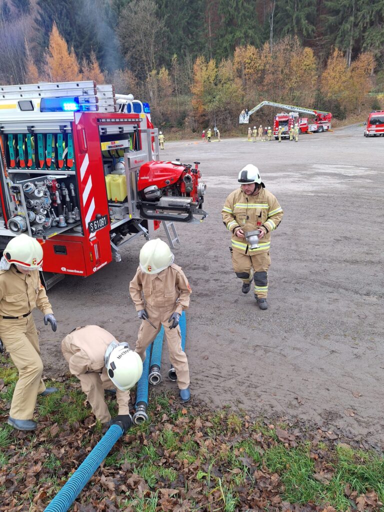 Vorbildlich bauten unsere Helfer von Morgen eine Angriffsleitung vom Tanklöschfahrzeug zum Brandobjekt auf. Der Einsatzleiter erkundete die Lage und veranlasste sofort dass die nachrückende Mannschaft des Unimog Löschfahrzeuges eine Saugstelle samt Löschleitung aus dem Gainfeldbach zu errichten hatte. Nach dem Aufbau der gesicherten Wasserversorgung konnte der Hüttenbrand und der Waldbrand gemeinsam erfolgreich mit mehreren Strahlrohren bekämpft werden.