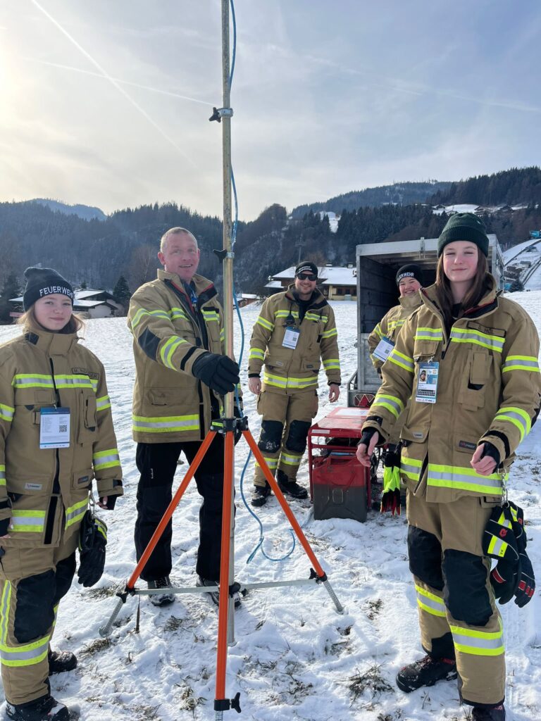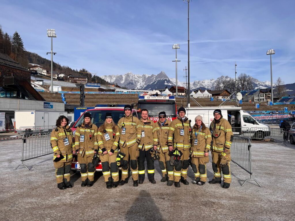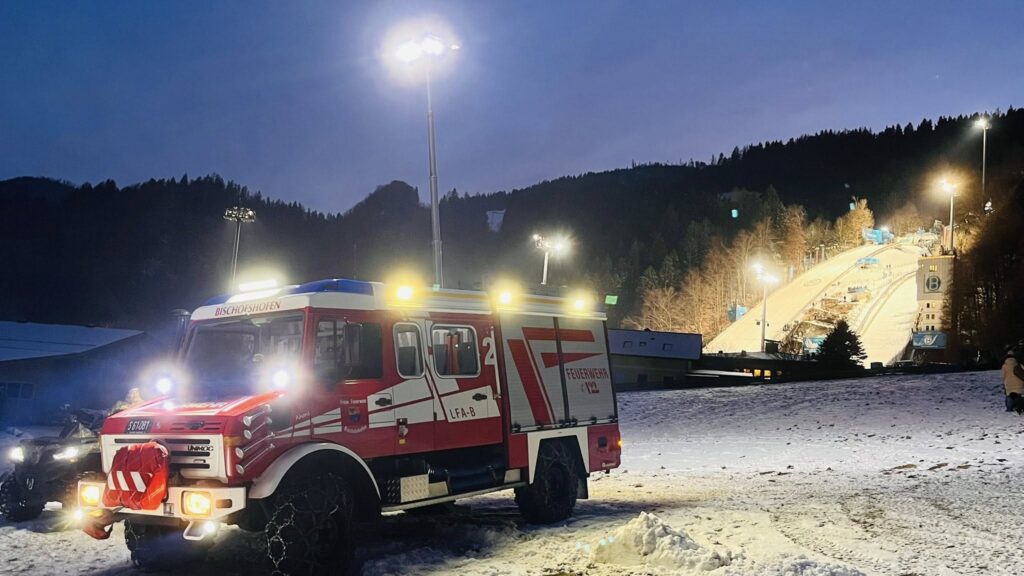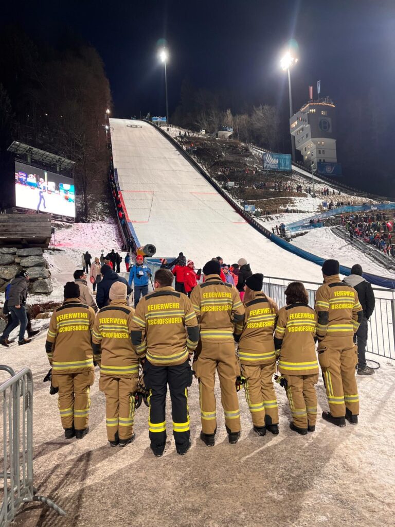 Tag 1 der 74. Vierschanzentournee neigt sich dem Ende zu. Gemeinsam mit den Kräften des Sicherheitsdienstes, der Polizei, den Rettungskräften und hunderten Freiwilligen sorgten wir für Sicherheit im Stadion und setzten die behördlich verordneten Auflagen zum Thema Brandschutz und Fluchtwegbeleuchtung um.